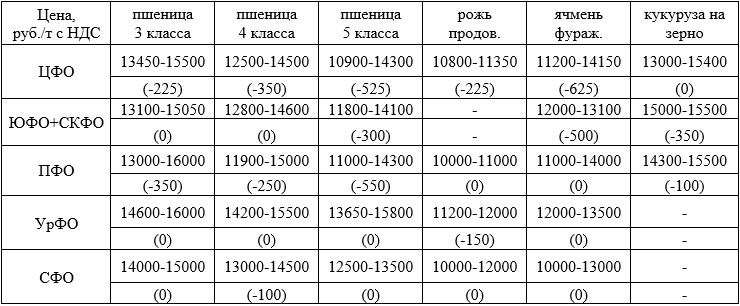 В азиатской части страны наблюдались следующие ценовые изменения: на Урале продовольственная рожь подешевела на 150 руб./т; в Сибири стоимость пшеницы 4-го класса уменьшилась на 100 руб./т.
