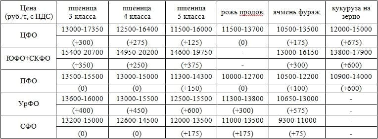 В южных регионах пшеница 3-го класса прибавила в стоимости 350 руб./т, пшеница 4-го класса – 250 руб./т, пшеница 5-го класса – 375 руб./т, фуражный ячмень – 300 руб./т, кукуруза на зерно – 600 руб./т.