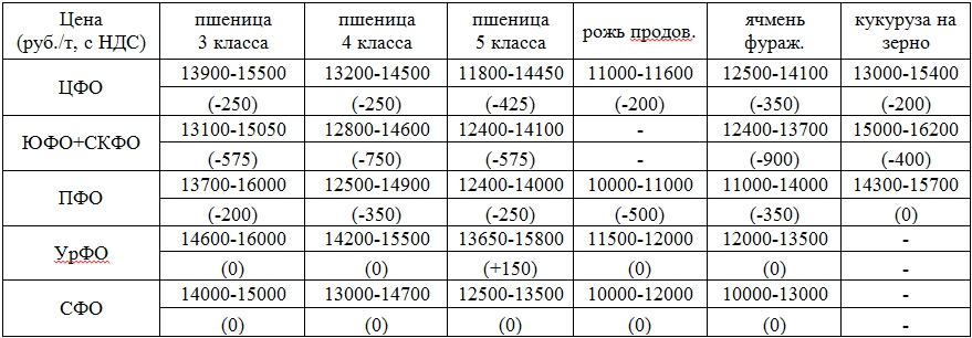 В Поволжье цена на пшеницу 3-го класса уменьшилась на 200 руб./т, пшеницу 4-го класса и фуражного ячменя – на 350 руб./т, пшеницу 5-го класса – на 250 руб./т, продовольственную рожь – на 500 руб./т.