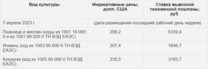 Ставки вывозных таможенных пошлин из РФ на зерно с 12-го апреля 2023 года
