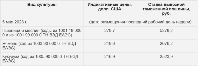 Ставки вывозных таможенных пошлин из РФ на зерно с 12-го мая 2023 года