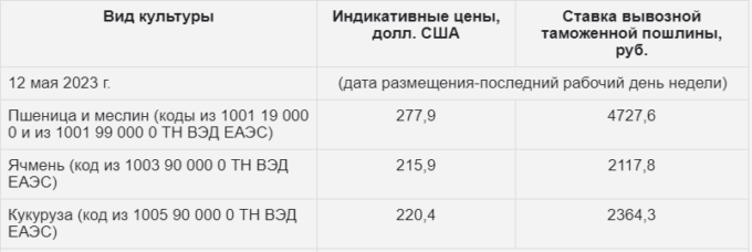 Ставки вывозных таможенных пошлин из РФ на зерно с 17-го мая 2023 года