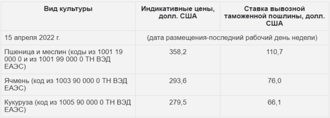 Ставки вывозных таможенных пошлин из РФ на зерно с 20-го апреля 2022 года