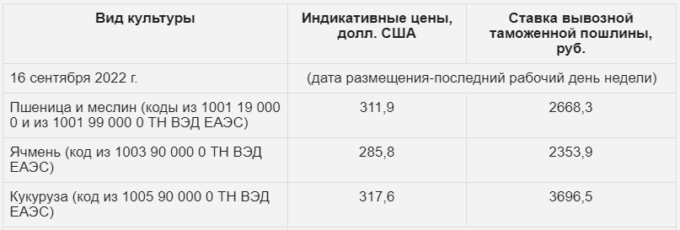 Ставки вывозных таможенных пошлин из РФ на зерно с 21-го сентября 2022 года