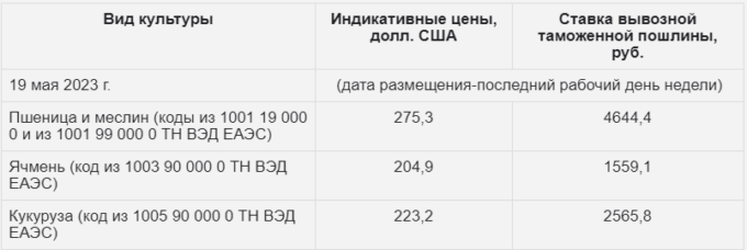 Ставки вывозных таможенных пошлин из РФ на зерно с 24-го мая 2023 года