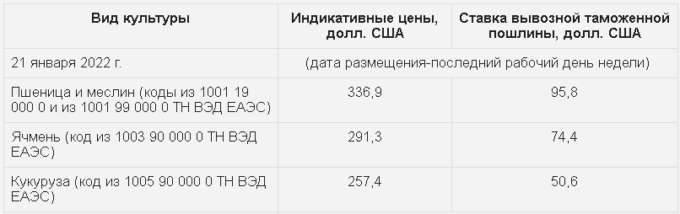 Ставки вывозных таможенных пошлин из РФ на зерно с 26-го января 2022 года