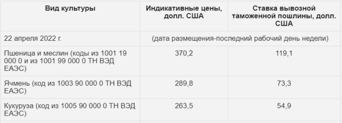 Ставки вывозных таможенных пошлин из РФ на зерно с 27-го апреля 2022 года