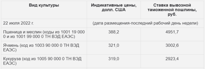 Ставки вывозных таможенных пошлин из РФ на зерно с 27-го июля 2022 года