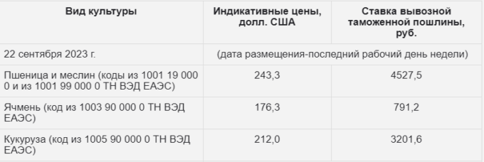 Ставки вывозных таможенных пошлин из РФ на зерно с 27-го сентября 2023 года