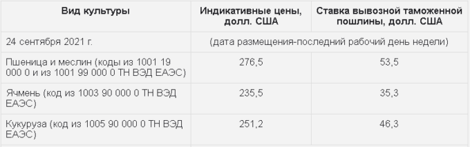 Ставки вывозных таможенных пошлин из РФ на зерно с 29-го сентября 2021 года
