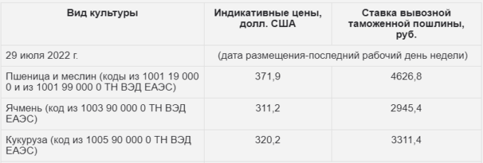 Ставки вывозных таможенных пошлин из РФ на зерно с 3-го августа 2022 года