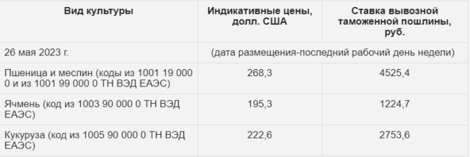 Ставки вывозных таможенных пошлин из РФ на зерно с 31-го мая 2023 года