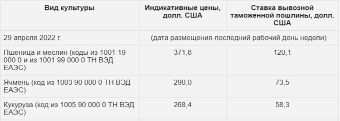 Ставки вывозных таможенных пошлин из РФ на зерно с 6-го мая 2022 года