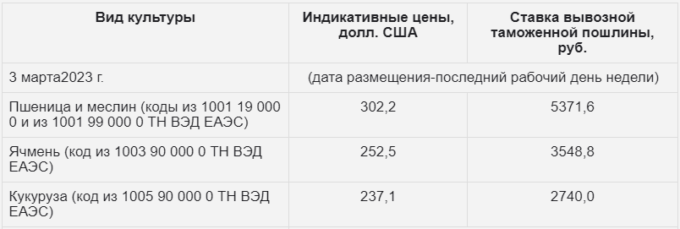 Ставки вывозных таможенных пошлин из РФ на зерно с 9-го марта 2023 года