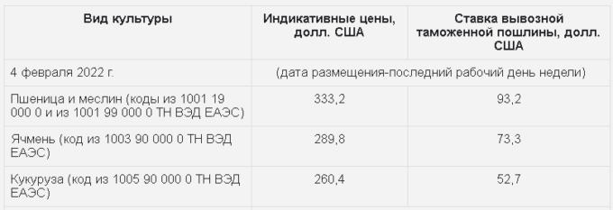 Ставки вывозных таможенных пошлин из РФ на зерно с 9-го февраля 2022 года
