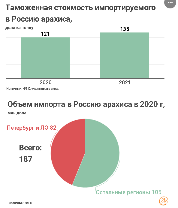 Ситуация с арахисом сложнее. Подавляющее количество его ввозится в страну для удовлетворения потребностей кондитерской промышленности. Почти все начинки шоколадных конфет делаются именно из него, и особой альтернативы у него нет, объясняет Наталия Ельченко. В прошлом году из-за коронавируса площади посадки арахиса в Бразилии сильно сократились, и цена поднялась. Но с другой стороны, отечественные кондитерские фабрики («Гринлайн» поставляет свою продукции лидерам рынка, к примеру Бабаевскому комбинату и фабрике им. Крупской) заметно снизили объемы закупки. Видимо, в России стали меньше покупать сладкое, предполагает Наталия Ельченко, у которой в порту Петербурга сейчас застряло 10 контейнеров. И непонятно пока, как в условиях падения спроса повышать цену на арахис, чтобы компенсировать внезапные дополнительные расходы на границе.