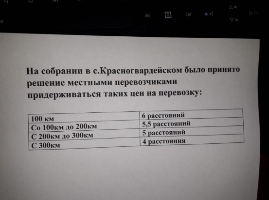– Привожу пример. Едем мы с Красногвардейского в Новороссийск. Расстояние у нас — 400 километров. Согласно таблице расстояний, умножаем на 4. Это у нас получается 1 600 рублей за тонну, то есть 1,6 рубля килограмм. Это минимальная расценка, – рассказывает активист.