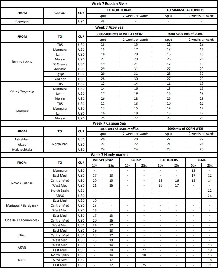 Каспий показал незначительный рост за отчетную неделю. Судовладельцы объясняют это возросшей активностью в связи с близостью Новруза. Многие иранские Импортеры традиционно увеличивают объем закупок зерновых перед праздниками. Возросший спрос на тоннаж позволил Судовладельцам преодолеть длительную тенденцию к снижению ставок: рынок показал рост почти со всех портов, за исключением Волгограда, где в преддверии начала навигации разница в ставках с морскими портами постепенно приходит к привычным значениям.