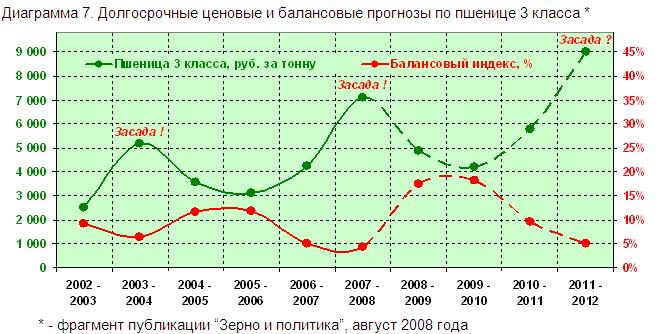 Это типичный “политизированный” долгосрочный объёмно – ценовой прогноз, который мы запротоколировали в дружественных агропромышленных СМИ без малого три года назад и что характерно, третий год напролёт среднегодовые цены пшеницы 3 класса сходятся практически “ноздря в ноздрю” и возникает вопрос: стоит ли менять прогноз на 2011 – 2012 годы?!