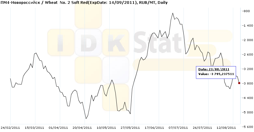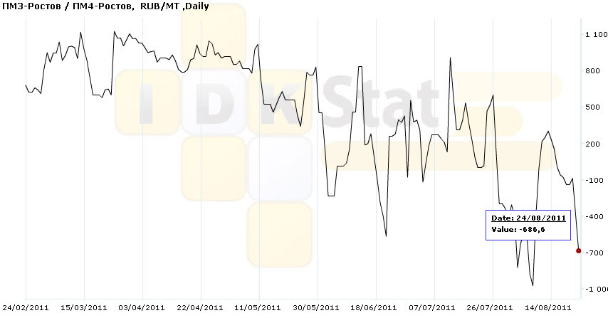 Данный график показывает спред (разницу) между стоимостью пшеницы 3-го и 4-го классов по базису Ростов. Из графика видно, что по состоянию на 24-ое августа пшеница 3-го класса торгуется почти на 700 рублей дешевле, чем пшеница 4-го класса.