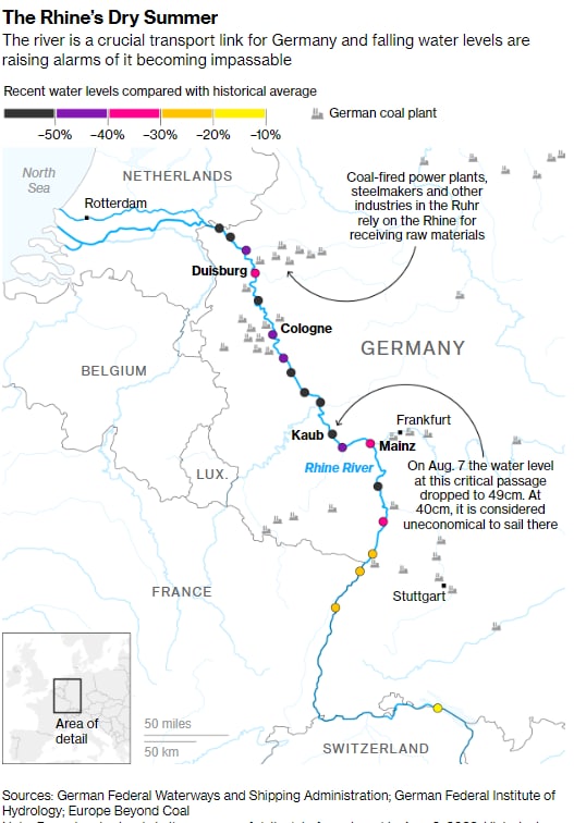 Рейн — опора немецкой, голландской и швейцарской экономики на протяжении столетий — должен стать практически непроходимым в ключевом пункте пути в конце этой недели, блокируя огромные потоки дизельного топлива и угля. Дунай, протянувшийся на 1800 миль через Центральную Европу к Черному морю, тоже засорен, что препятствует торговле зерном и другим товарам.