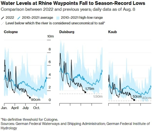В сочетании с ростом цен на газ, поскольку Германия прекращает импорт из России, это представляет угрозу для внутренних заводов, таких как завод BASF SE в Людвигсхафене. Если реки становятся все более непредсказуемыми, эти объекты теряют конкурентоспособность.