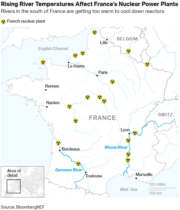 Повышение температуры рек влияет на работу французских атомных электростанций. Реки на юге Франции становятся слишком теплыми, чтобы охлаждать реакторы. Источник: BloombergNEF.