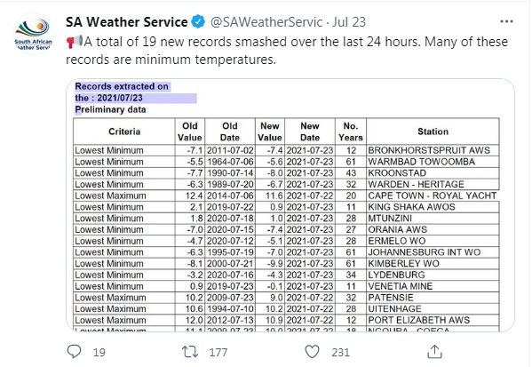 Предыдущие рекорды в ЮАР по низким температурам были более скромные, некоторые из них были установлены более 20 лет назад. До этой ночи самой минимальной температурой, которую когда-либо фиксировали в стране, считалась -8,1º в 2000 году.