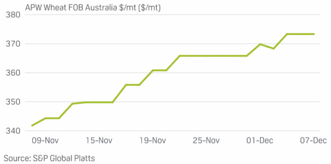 По данным S&P Global Platts, 7 декабря цены на пшеницу APW на условиях FOB составляли 372,50 доллара за тонну по сравнению с 341 долларом за тонну месяц назад.