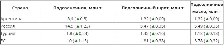 Согласно отчету, прогноз урожая подсолнечника и его продуктов переработки в основных странах-производителях (по сравнению с ожидаемым в 2020/21 МГ):