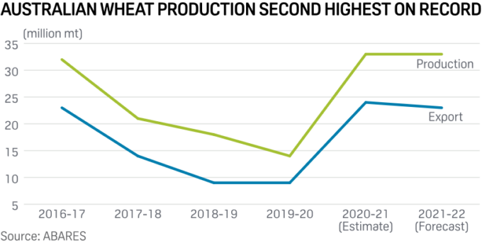 По прогнозу Австралийского бюро экономики сельского хозяйства и природных ресурсов (ABARES), в 2021/22 году страна произведет второй по величине урожай пшеницы в истории — 32,6 млн тонн, что немного ниже оценки предыдущего года в 33,3 млн тонн, при этом экспорт прогнозируется на уровне 23 млн тонн.