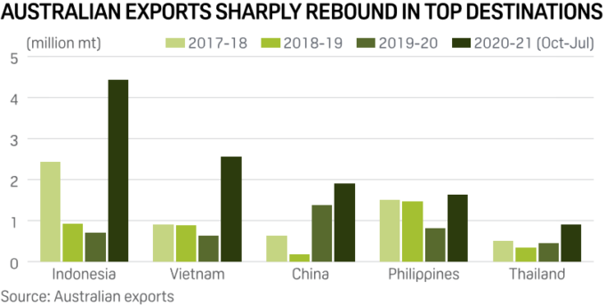 Плохой урожай в Аргентине и экспортные ограничения в России, действующие с конца 2020 года, совпавшие с началом австралийского маркетингового года, вернули австралийских поставщиков в игру.