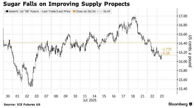 Самый активный контракт в Нью-Йорке упал на 1,5% до самого низкого уровня с 3 июля. Фьючерсы на этой неделе снизились примерно на 4% из-за ожиданий обильных поставок от ведущих производителей сахара — Бразилии, Индии и Таиланда.