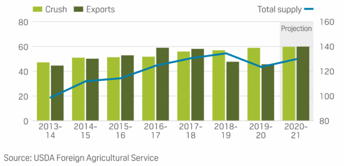 Министерство сельского хозяйства США прогнозирует рост производства сои на 17% по сравнению с прошлым годом до 113,5 млн. тонн в 2020-21 году, в основном за счет увеличения урожайности на 6% до 50,7 бушелей / акр и увеличения площадей на 8% до 83,1 млн. акров.