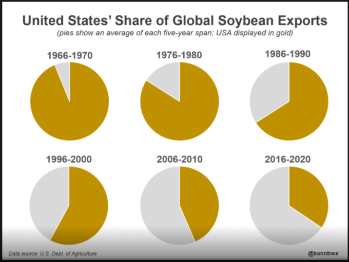 Доля в экспорте сои претерпела наиболее значительный сдвиг. Огромный скачок в технологиях и исследованиях в США в середине 20-го века сделал страну к 1970 году практически единственным поставщиком сои, на которого приходилось почти 95% мирового экспорта.