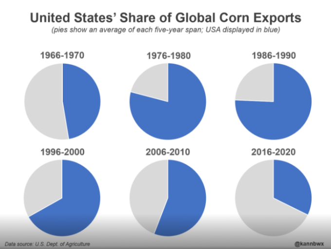 Соединенные Штаты на протяжении многих десятилетий были известны как страна, занимающая лидирующие позиции по экспорту кукурузы, сои и пшеницы. Но хотя объемы торговли остаются исторически высокими, относительное влияние страны на мировом рынке сейчас меньше, чем когда-либо.