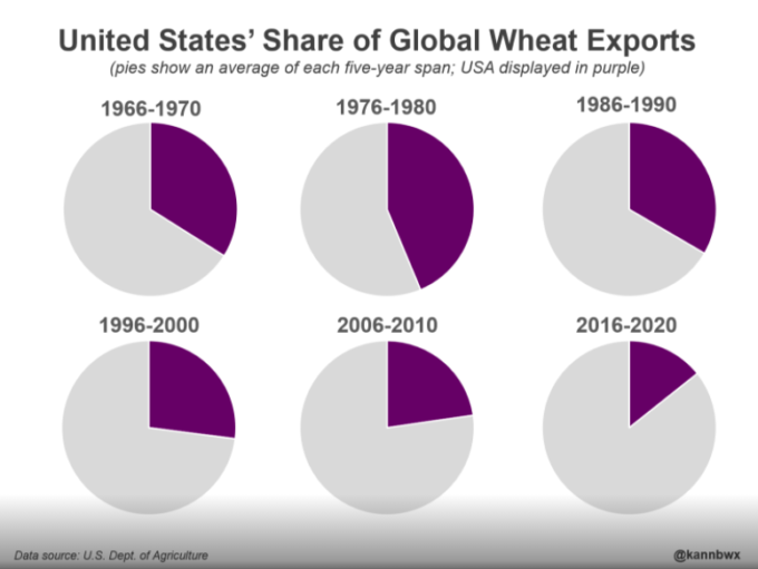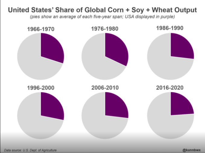 Сегодня Соединенные Штаты экспортируют чуть более четверти мирового объема кукурузы, пшеницы и сои, по сравнению с более чем половиной 30 лет назад. В стране также производится около четверти этих культур, меньшая часть, чем в предыдущие десятилетия, хотя спад намного менее резкий по сравнению со спадом экспорта.