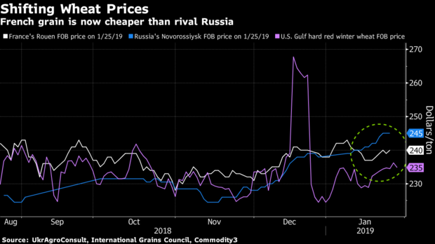 Цены на пшеницу в России достигли четырехлетнего максимума на фоне снижения предложения, поднявшись более чем на 2 процента со времени проведения последнего тендера 9 января. Это повысило конкурентоспособность других предложений. Американского зерна не было среди самых низкоценовых предложений, сделанных во вторник, хотя французское зерно было самым дешевым после румынского.