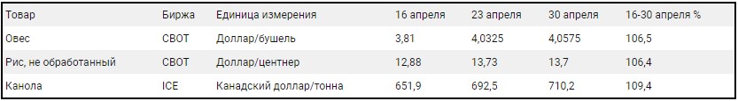 Динамика котировок овса, риса и канолы с 16 по 30 апреля