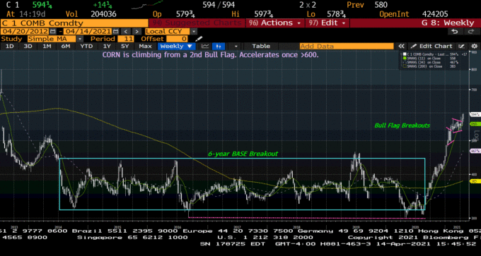 Фундаментальные показатели кукурузы, и без того оптимистичные, усиливаются еще больше. В прошлую пятницу Министерство сельского хозяйства США спрогнозировало сокращение запасов кукурузы 2020-21 маркетингового года до 1,35 миллиарда бушелей. Это на 10% ниже мартовского прогноза.