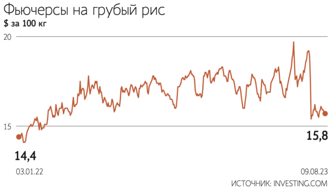 Цены на рис стремительно растут с июля после объявления Всемирной метеорологической организацией ООН о возобновлении после семилетней паузы явления Эль-Ниньо – феномена глобальных колебаний температуры в верхних слоях океана, вызывающих засухи. Согласно прогнозам организации, явление продлится минимум до конца 2023 г. Дополнительным фактором, повысившим цены на рис, стало решение Индии 20 июля о запрете экспорта 80% риса (кроме сорта басмати) для сдерживания внутренних цен. Индия обеспечила 40,5% мирового экспорта риса в 2022/23 сельскохозяйственном году (начинается в июне), по данным минсельхоза США. Она экспортирует культуру в 100 стран мира.
