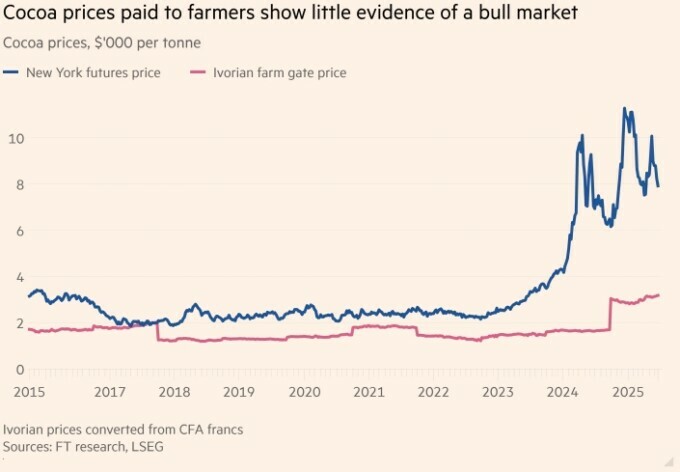 Но, по словам аналитиков, кризис с поставками усугубился из-за политики двух стран в отношении форвардных продаж. Вместо того чтобы привязывать цены на фермах к ценам на мировых рынках, регулирующие органы Кот-д’Ивуара и Ганы — Conseil du Café-Cacao (CCC) в Абиджане и Cocobod в Аккре — устанавливают фиксированную цену в начале каждого сезона сбора урожая. Она основана на форвардных контрактах, заключаемых с экспортёрами за несколько месяцев вперёд. Фермеры говорят, что они не участвуют в этом процессе.
