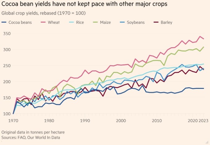 С начала 2023 года фьючерсы на какао в Нью-Йорке и Лондоне, которые в течение многих лет торговались в относительно узком диапазоне, выросли более чем в три раза, поскольку предложение не удовлетворяет спрос. Большинство проблем в этом секторе связано с Кот-д’Ивуаром и Ганой, которые вместе производят около двух третей мирового объёма какао-бобов.