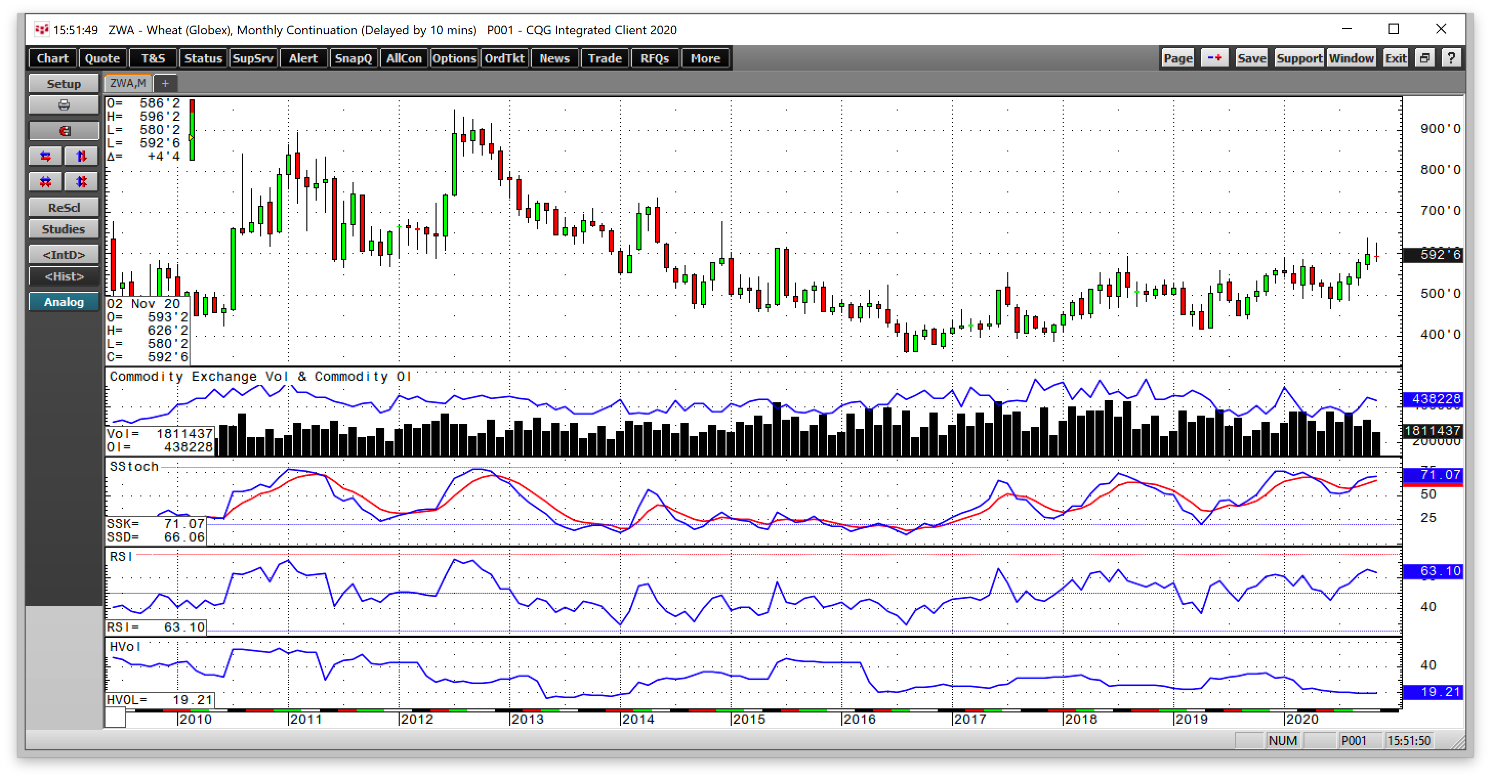 Месячный график показывает, что фьючерс на пшеницу зафиксировал очередной растущий пик в октябре — на уровне $6,3820. По состоянию на конец прошлой недели контракт торговался чуть ниже 6 долларов за бушель. В прошлом месяце фьючерс достиг уровня декабря 2014 года.