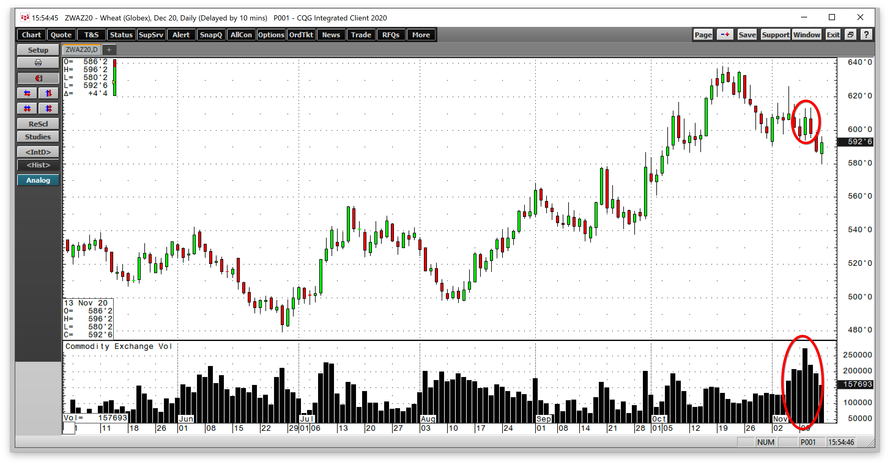 Как видно из дневного графика, ралли пшеницы началось на отметке конца июня в $4,7950, а в прошлом месяце декабрьский фьючерс торговался по $6,3825 за бушель. 10 ноября пшеница продемонстрировала еще один бычий разворот, при этом объем торгов достиг уровней середины февраля.