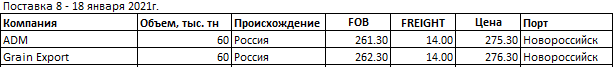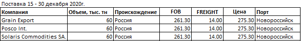 Государственное агентство Египта GASC 5 ноября провело тендер на закупку пшеницы с двумя периодами поставок. По результатам тендера было закуплено 300 тыс. тонн мягкой мукомольной пшеницы: 180 тыс. тонн с поставкой 15 – 30 декабря 2020 г. и 120 тыс. тонн с поставкой 8 – 18 января 2021 г. Правительство Египта заключило 5 сделок на поставку пшеницы. Все компании, представленные в списке, из России, порт отгрузки – Новороссийск.