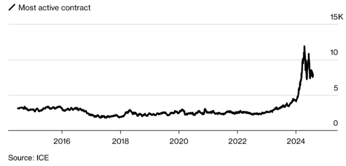 Аналитики подразделения BMI компании Fitch Solutions прогнозируют, что фьючерсы на какао на второй месяц в Нью-Йорке будут в среднем стоить $7 000 за тонну в 2024 году. Это заметно ниже, чем $11 000 в начале этого года, однако в течение нескольких десятилетий наиболее активные фьючерсы в среднем стоили менее $2 000, а декабрьский контракт в настоящее время торгуется выше $7 000.