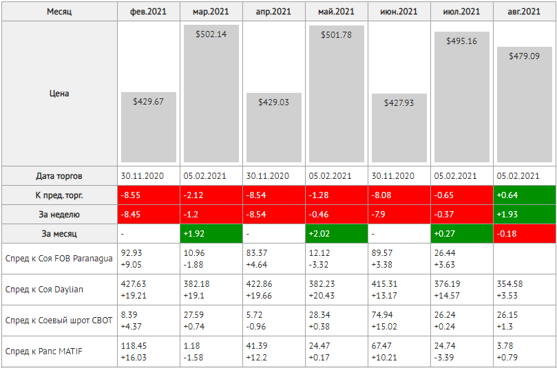— стоимость предложений на поставку на август 2021 г. составила 479.09 USD/T, что является максимальной ценой поставки на август за последнюю неделю (предыдущий максимум был 27.01.2021 г. и составил 479.27 USD/T).