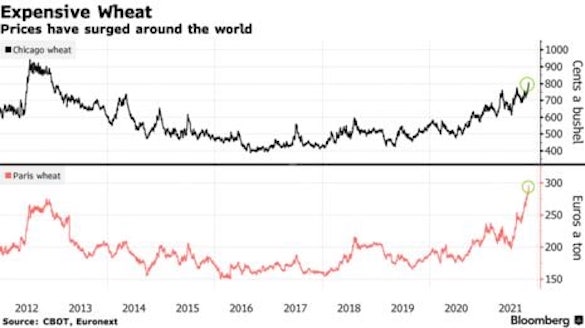 На чикагской бирже стоимость пшеницы достигла 8,0575 доллара за бушель, переписав максимум с декабря 2012 года. В Париже фьючерсы достигли рекордных 297 евро (345 долларов) за тонну на фоне ожиданий, что предстоящие урожаи в Аргентине и Австралии не могут облегчить нехватку зерна, в то время как поля в других странах только начинают засеваться.