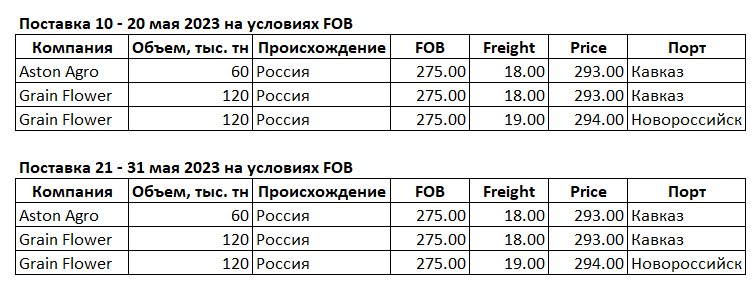 Диапазон предложения колебался от 272 до 292 долларов за тонну. Победила российская пшеница. Совершены сделки общим объемом 600 тысяч тонн по цене 275 долларов за тонну плюс 18 — 19 долларов фрахт в зависимости от порта поставки. Даты поставки с 10 по 20 мая и с 21-по 31-е мая 2023-го года.